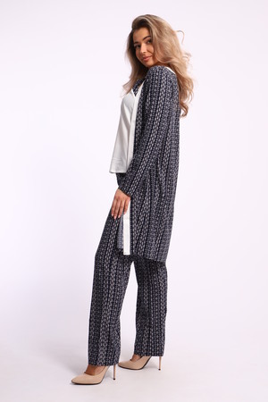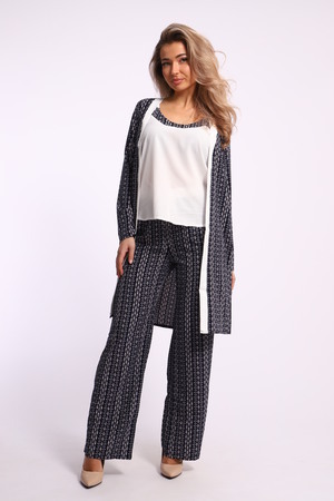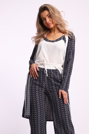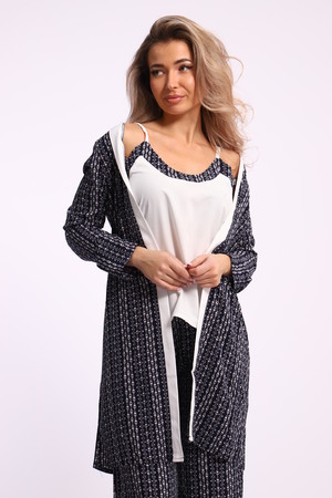 Погрузитесь в комфорт и стиль с нашим роскошным женским домашним костюмом, который станет неотъемлемой частью вашего гардероба. Этот элегантный комплект состоит из трех тщательно подобранных предметов: топ, брюки и халат, создающих гармоничный ансамбль для домашнего уюта и расслабления.