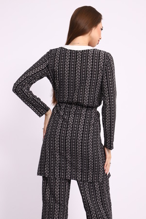 Погрузитесь в комфорт и стиль с нашим роскошным женским домашним костюмом, который станет неотъемлемой частью вашего гардероба. Этот элегантный комплект состоит из трех тщательно подобранных предметов: топ, брюки и халат, создающих гармоничный ансамбль для домашнего уюта и расслабления.