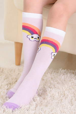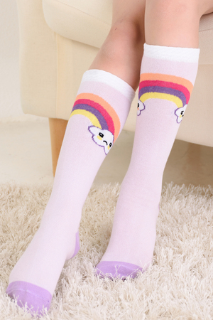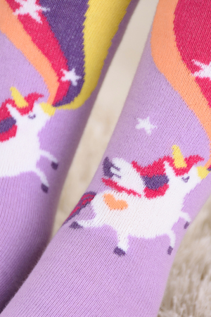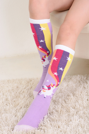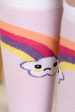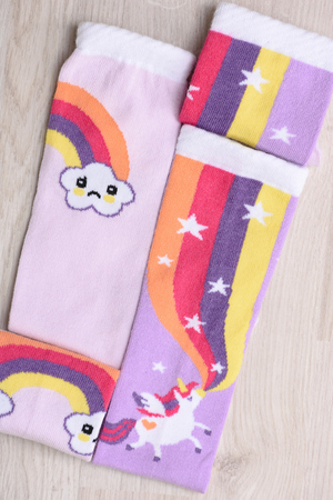Яркие детские гольфы с рисунками в виде радуги и единорогов. Поднимут настроение вашему ребенку и станут любимым предметом гардероба. В упаковке 2 пары