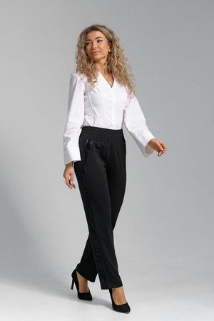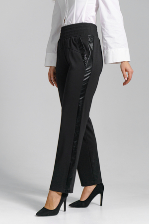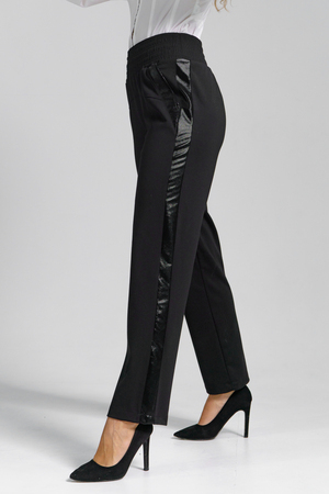 Женские стильные прямые брюки выполнены из двух видов материала: качественная эко-кожа и воздухопроницаемый плотный стрейч - трикотаж нейлон - рома. Два этих дополняющих друг друга материала создают комфорт, удобство и поддерживают температуру тела постоянной вне зависимости от условий внешней среды. Качественный материал не теряет свойств при интенсивной эксплуатации. Хорошо сохраняет первоначальную форму и презентабельный внешний вид. Неприхотливый, элементарно стирается, быстро сохнет, не нуждается в глажке. Модель такого плана поможет Вам создать сногсшибательный образ. Изделие выполнено на широком поясе - резинке с завышенной линией талии, что делает Вашу фигуру стройной и подтянутой. По бокам изделия имеется вставка и карман-обманка из экокожи, актуальной в этом и следующем сезоне. Брюки такого плана станут прекрасной основой любого образа, как на каждый день, так и на праздник. А размерная сетка не оставит без внимания прекрасных представительниц корпулентных форм, поэтому размерный ряд включает в себя большие размеры. Классические брюки с резинкой на поясе прекрасно подойдут как для повседневного образа на работу, в офис, так и на любое мероприятие. Брюки больших размеров вытягивают силуэт, делая ноги зрительно стройнее и длиннее, при этом надежно скрывая любые несовершенства. Легкие и комфортные, представлены стандартных и больших размеров плюс сайз plus size. Брюки с зауженными к низу штанинами позволяют создавать модные образы, а завышенная линия талии обеспечивает комфортную посадку. Универсальные, идеально садятся, не сползают и «правильно» ведут себя при движении. Из-за особенностей кроя визуально вытягивают силуэт и делают его тонким и изящным. Отличный вариант создать стильный образ для прогулок.  Очень комфортные в повседневной носке в любой сезон.  Если вы ищете брюки на каждый день, то эта удобная и практичная модель для Вас!