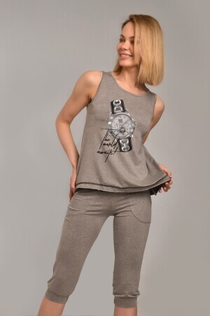Стильный вискозный комплект с оригинальным печатным рисунком на майке трапециевидного силуэта, низ обработан контрастной полосой. Бриджи на притачном поясе с регулировкой на кулисе, низ на манжете.