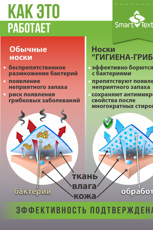 Противогрибковая защита: Носки обработаны специальными средствами, которые предотвращают развитие грибковых инфекций и защищают кожу ног от бактерий.