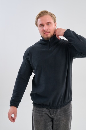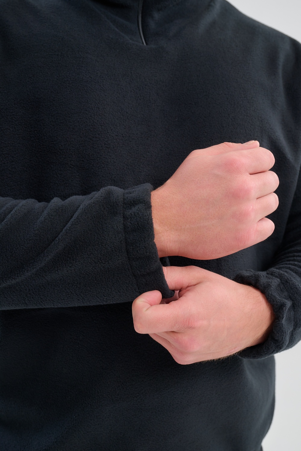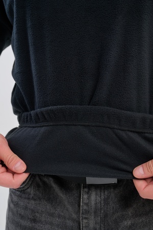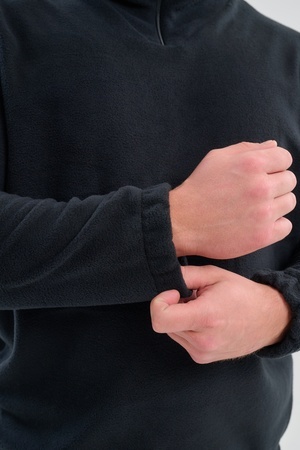 Мужская толстовка выполнена из приятного на ощупь флиса из 100% полиэстера, обладающего отличными теплоизоляционными свойствами и обеспечивающего максимальный комфорт при любых погодных условиях. Особенность модели заключается в том, что по низу изделия и на манжетах вшиты резинки, обеспечивающие плотное прилегание, сохранение формы изделия и защиту от проникновения холода.