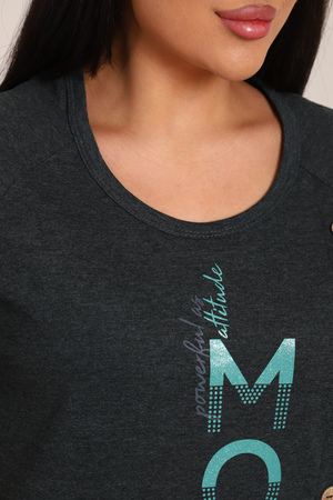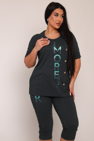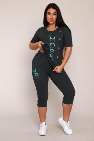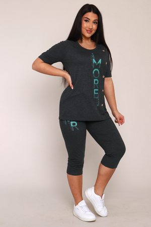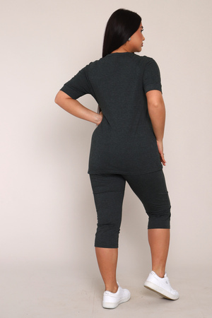 Комплект состоит из футболки и бриджей. Свободная футболка. Бриджи плотно прилегающие. Комплект подойдет на любой тип фигуры.