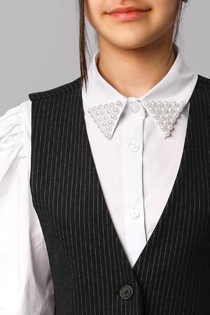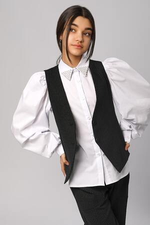 Блузка для девочки Соль&Перец, на пуговицах, из натурального хлопка. Особенностью блузки являются пышные рукава фонарики и отложной воротник украшенный жемчугом, которые добавляют ей изящества и уникальности. Блузка прекрасно сочетается с брюками или с юбкой, подчеркнёт индивидуальный стиль девочки, и разнообразит ее повседневный школьный образ.