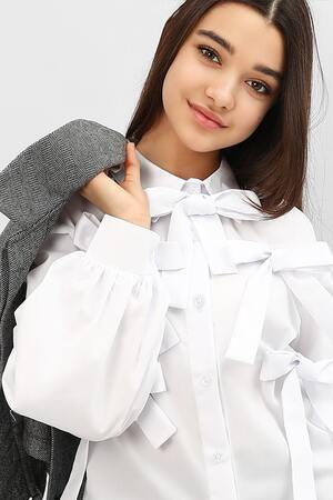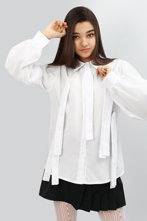 Блузка для девочки Соль&Перец, на пуговицах, из натурального хлопка. Особенностью блузки являются пышные рукава фонарики и пришитые ленты из основной ткани, которые добавляют ей изящества и уникальности. Блузка прекрасно сочетается с брюками или с юбкой, подчеркнёт индивидуальный стиль девочки, и разнообразит ее повседневный школьный образ.