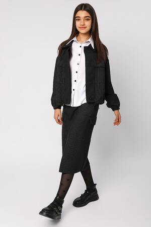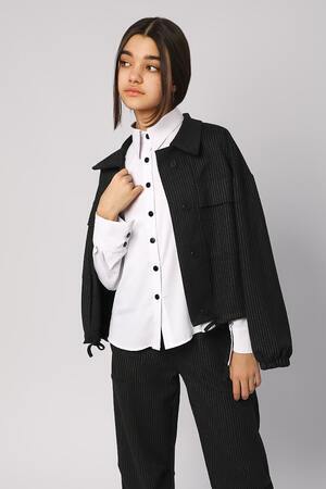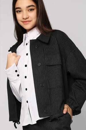 Бомбер для девочки Соль&Перец на пуговицах с потайной планкой, отложным воротником и большими накладными карманами с клапаном. Рукава на мягкой эластичной резинке, низ бомбера дополнен кулиской. Бомбер выполнен из износостойкой трикотажной ткани которая долго сохраняет форму и привлекательный внешний вид. Бомбер прекрасно сочетается с юбками и брюками. Подойдёт для посещения школы, официального или праздничного мероприятия.