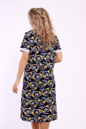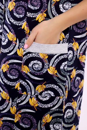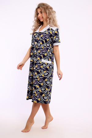 Халат домашний на пуговках, удлиненный, воротник из отделочной ткани. По полочке - рельефные швы, они обеспечивают удобство посадки. Имеются боковые карманы.
