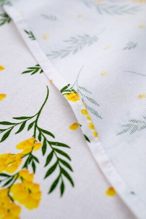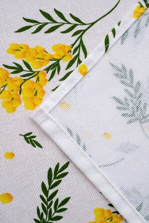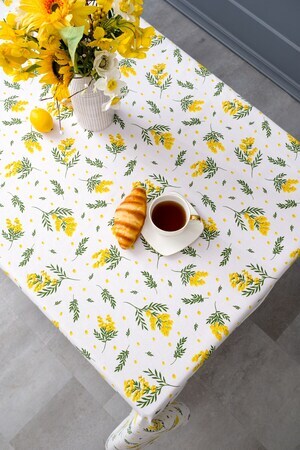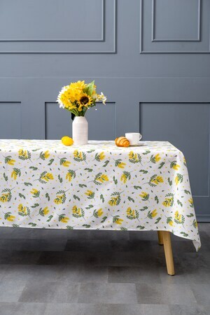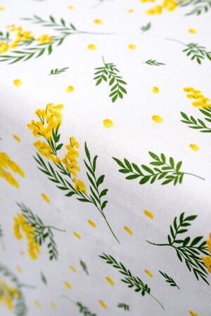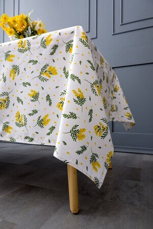 Белый цвет скатерти создает чистый и свежий вид, а желтые мимозы добавляют нотку яркости и радости. Это отличный подарок на 8 марта для вашей любимой женщины, который она будет использовать с удовольствием каждый день.