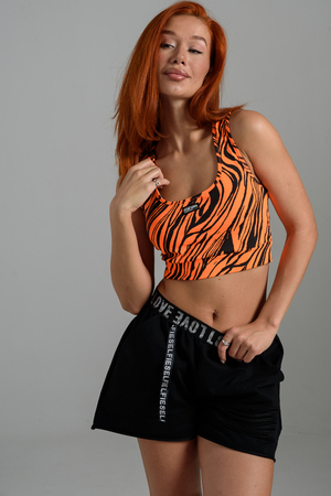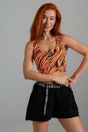 Топ на узких бретелях, с округлой горловиной на полочке и вырезом "борцовка" сзади. Горловина, проймы и вырез на спинке обработаны бейкой из основного полотна.