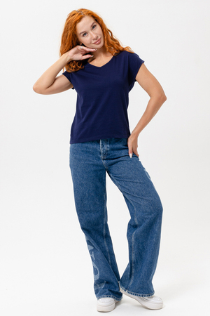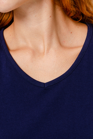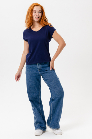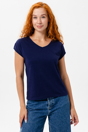 Футболка полуприлегающего силуэта, средней длины, с V-образной горловиной. Рукав цельнокроеный, короткий. Горловина и пройма обработаны бейкой из основного полотна.