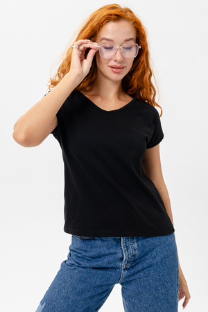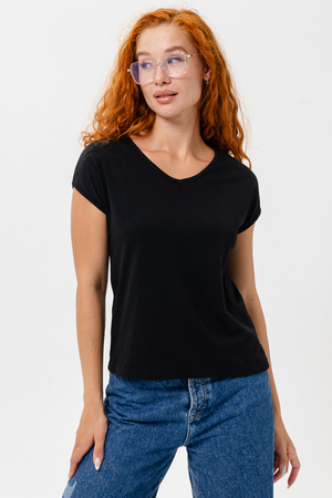 Футболка полуприлегающего силуэта, средней длины, с V-образной горловиной. Рукав цельнокроеный, короткий. Горловина и пройма обработаны бейкой из основного полотна.