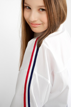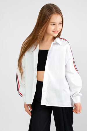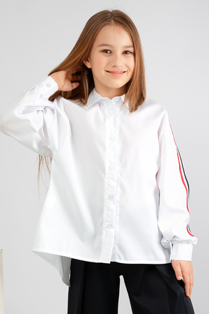 Блузка для девочки Соль&Перец, модель оверсайз, на пуговицах. Удлиненная спинка с разрезом, рукав-реглан с лампасами, линия плеча приспущена. Блузка прекрасно сочетается как с брюками, так и с юбкой, подчеркнет индивидуальный стиль девочки, и разнообразит ее повседневный школьный образ.