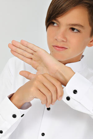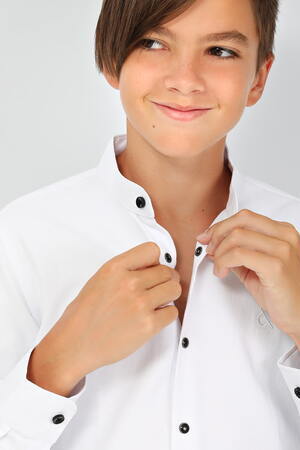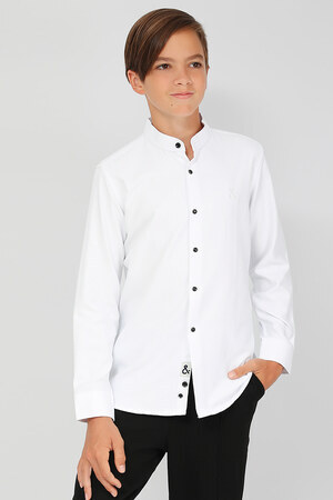 Рубашка для мальчика Соль&Перец приталенного кроя, на кнопках, с воротником-стойкой. Рубашка выполнена из натурального хлопка премиального качества. Рубашка идеально сочетается с брюками любого фасона и подойдет как для школы, так и для торжественного мероприятия.