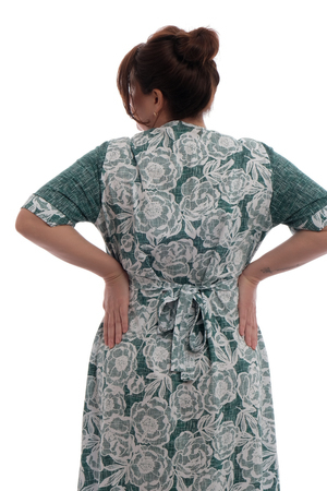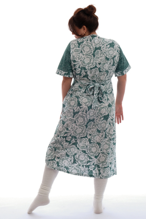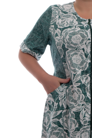 Необычное композиционное решение деталей, а также сочетание актуальной расцветки ткани создает яркий летний образ. Этот летний халат прекрасно подойдет для беременных женщин благодаря своему свободному крою, молнии и завязкам со спины, которые облегчают процесс одевания и раздевания. Кроме того, он может стать отличным выбором для поездки в отпуск на море, на дачу или для похода в бани, в сауну, в бассейн, в душ, на пляж, в ванную, для отдыха в отеле или санатории, а также на СПА или в роддом.