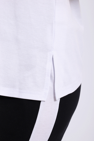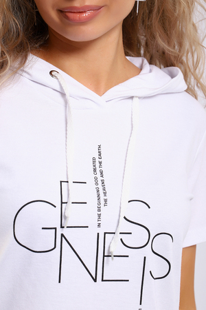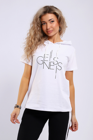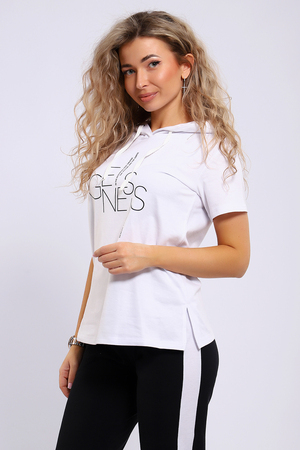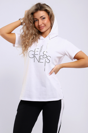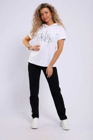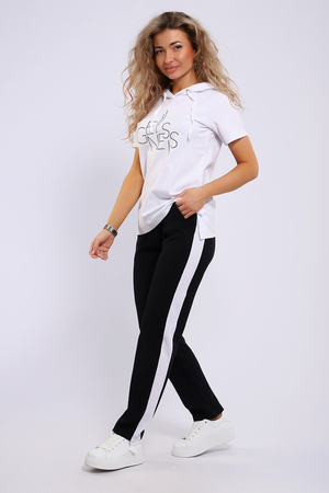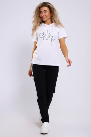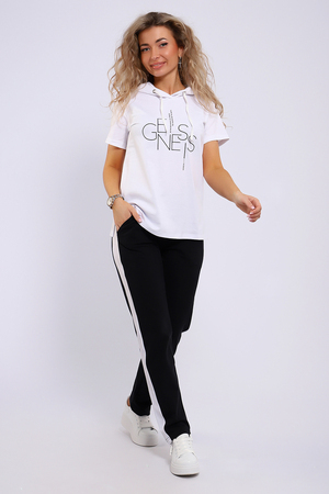 Легкий спортивный трикотажный костюм позволит вам выглядеть сногсшибательно в любой ситуации! Костюм прекрасно подойдет для занятий спортом, пробежек или прогулок! Кофта белого цвета, с надписью латинскими буквами в цвет брюк,  имеет капюшон, способный защитить волосы от солнечных лучей, ветра или дождя. Объем капюшона регулирует изящный шнурок. На брюках имеются лампасы белого цвета, гармонирующие с цветом кофты.