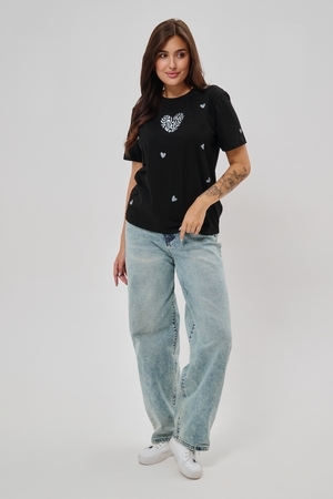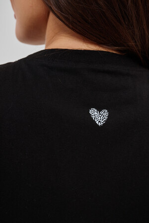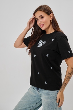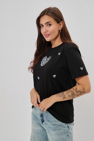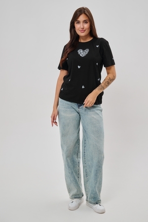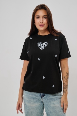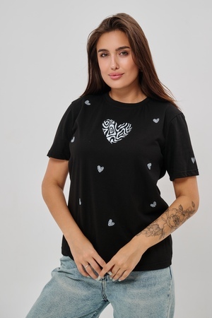 Женская футболка элегантного приталенного кроя с короткими рукавами и классическим круглым вырезом горловины. Минималистичный дизайн дополнен нежными маленькими принтами в форме сердец с узором зебры, создающими тонкий акцент на образ. Материал приятен к телу, обеспечивает комфорт и свободу движений. Идеально подойдет для повседневного стиля, подчеркивая женственность и утонченность облика обладательницы.