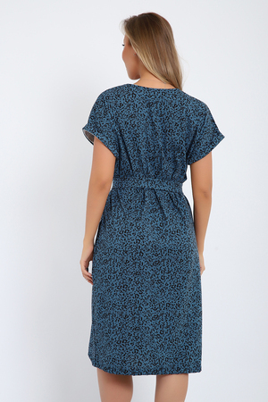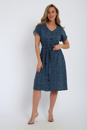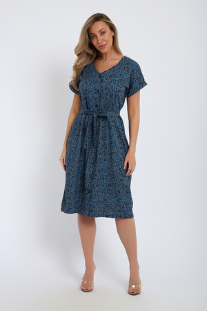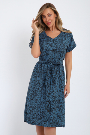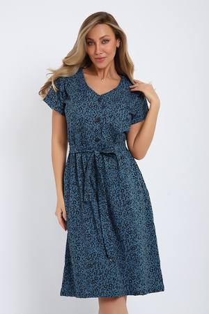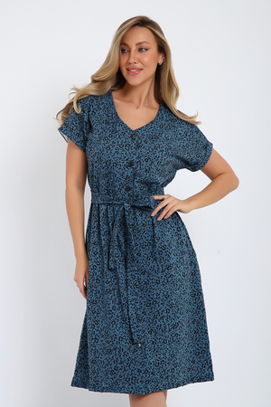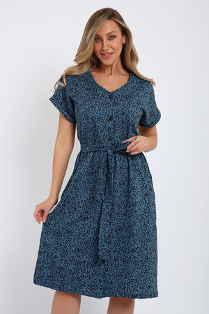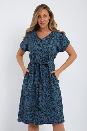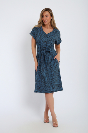 Платье на пуговицах свободного кроя с отворотными манжетами на спущенном плече. В боковых швах удобные карманы. Пояс из основной ткани не зафиксирован, что позволяет подчеркивать фигуру на любом уровне талии.