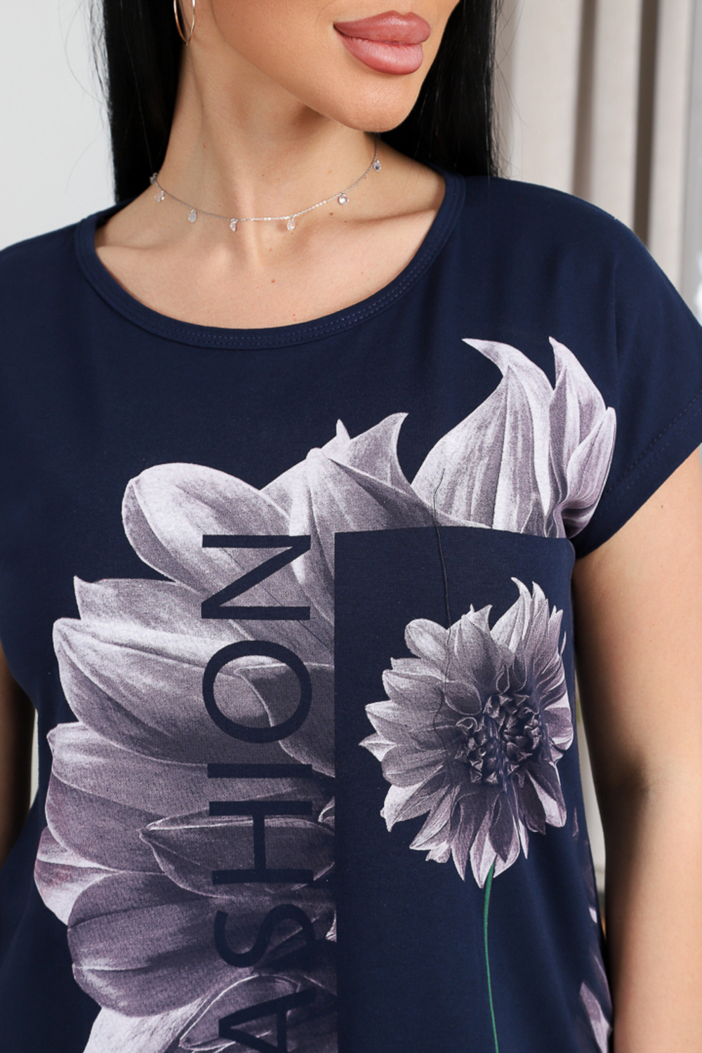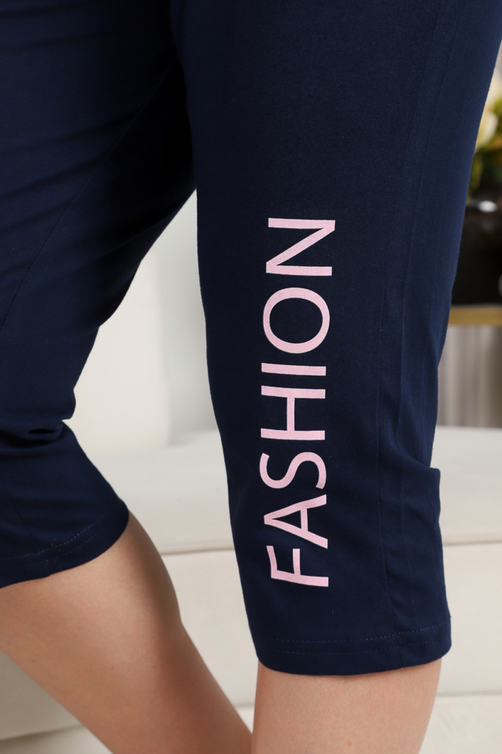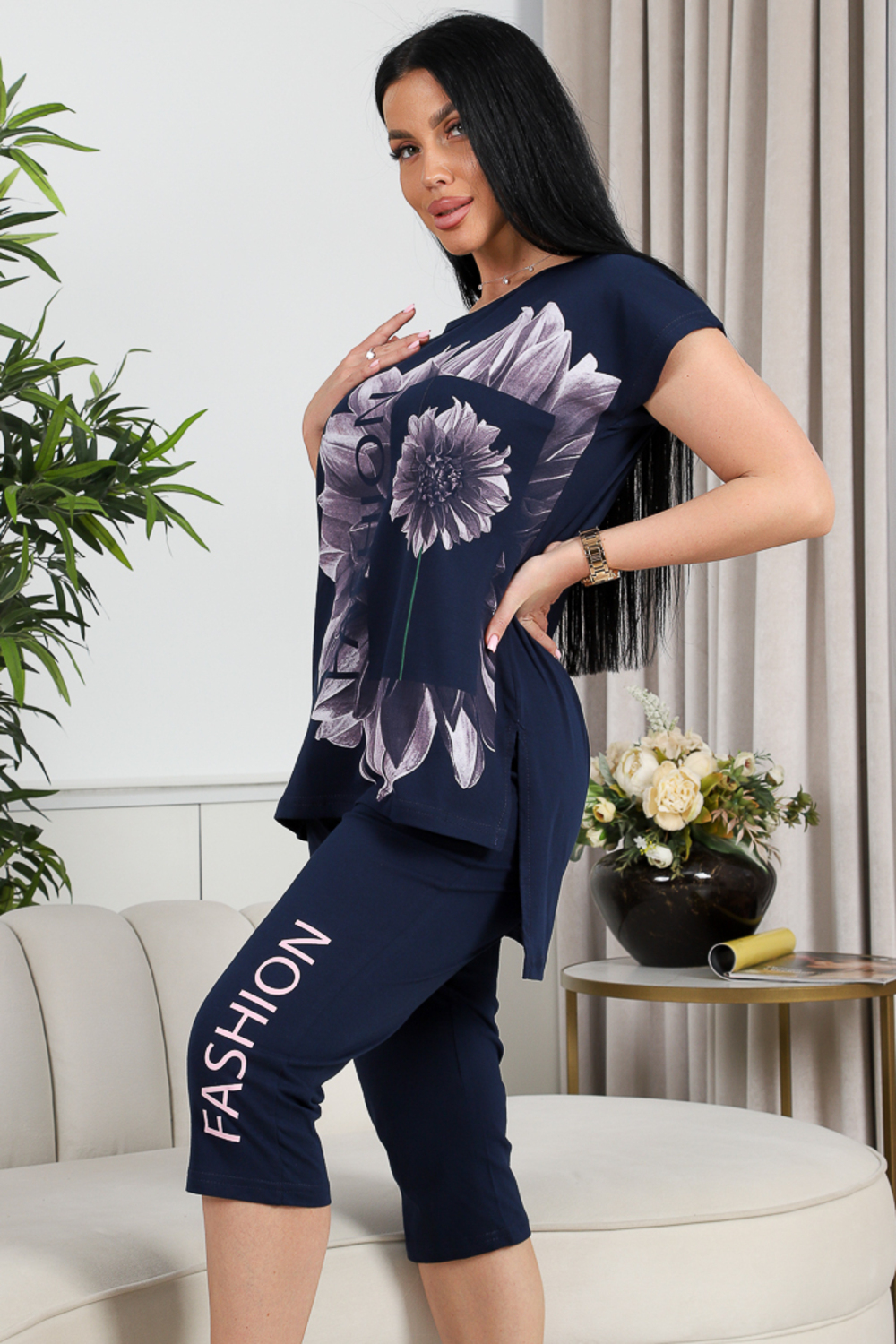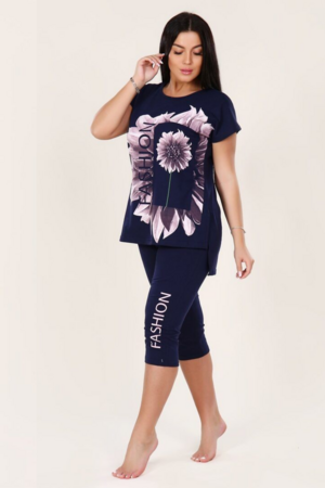 Женский костюм, состоящий из футболки с удлинённой спинкой и бриджей, выполнен из лёгкого и приятного на ощупь материала — 100% хлопка в исполнении кулирной глади. Элегантный флористический принт с надписями в стиле FASHION flower придаёт комплекту оригинальности и стиля.