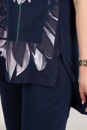 Костюм доступен в широком размерном ряде: 46, 48, 50, 52, 54, 56, 58, 60, что позволяет подобрать идеальный вариант для каждой женщины. Темно-синий цвет изделия делает его универсальным и легко сочетаемым с различными аксессуарами и обувью.