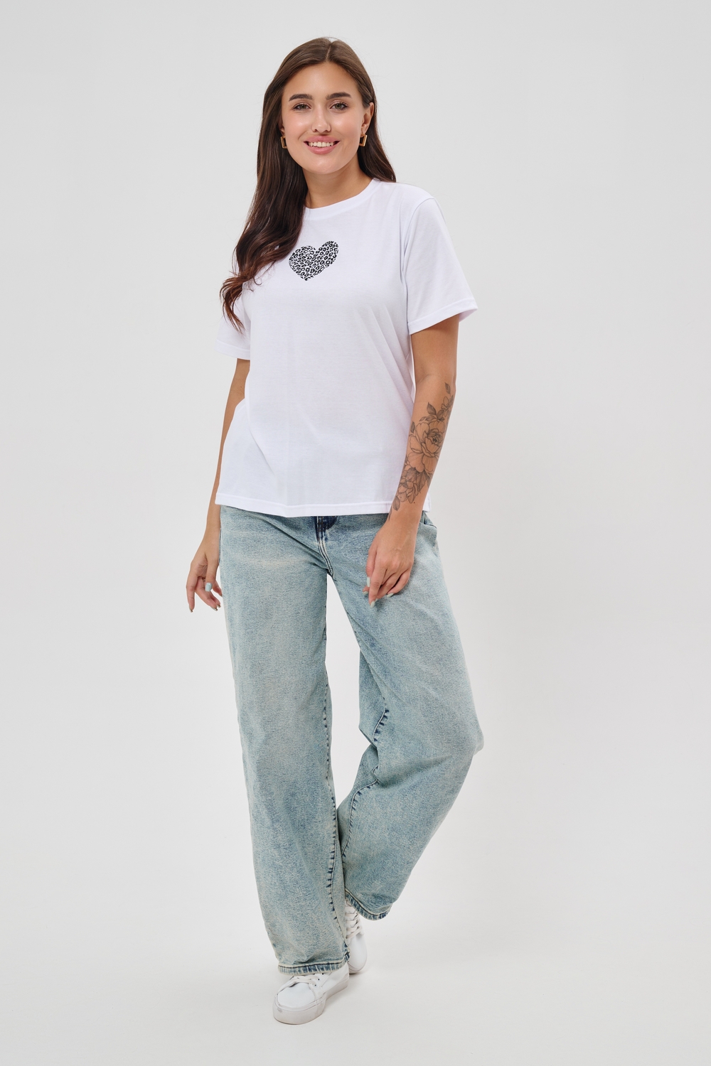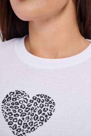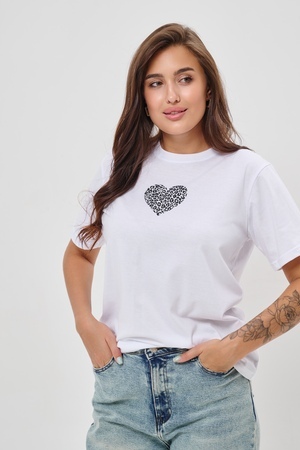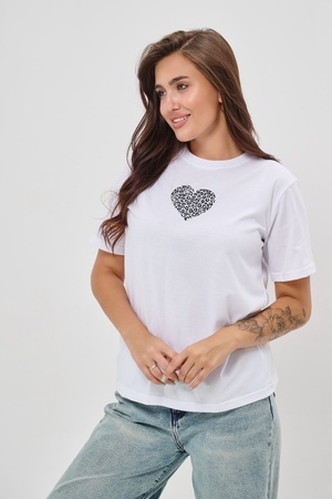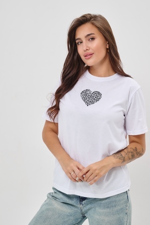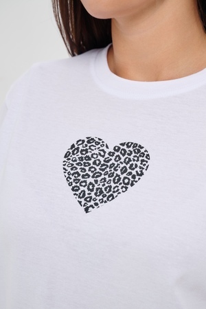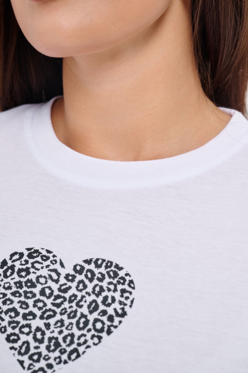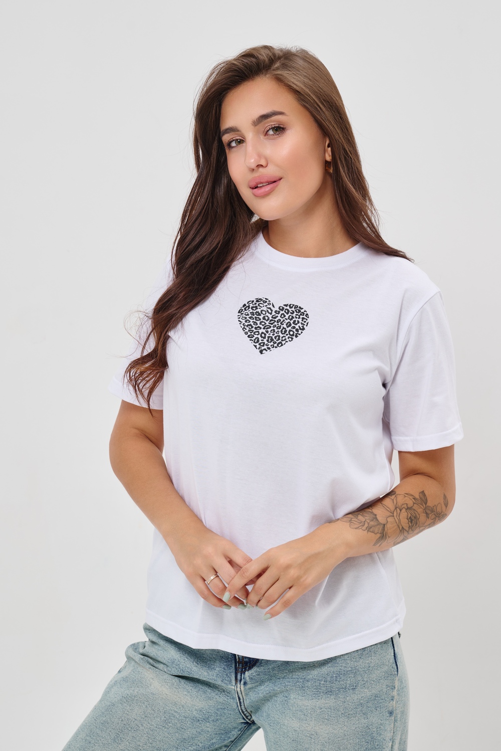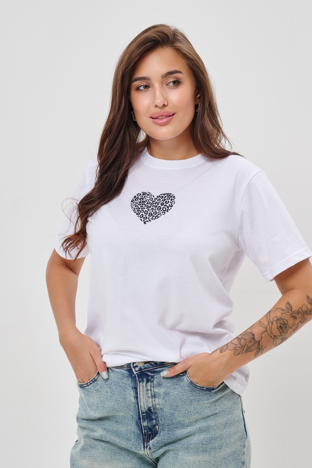 Женская футболка элегантного приталенного кроя с короткими рукавами и классическим круглым вырезом горловины. Минималистичный дизайн дополнен нежным принтом в форме сердца с леопардовым узором, создающими тонкий акцент на образ. Материал приятен к телу, обеспечивает комфорт и свободу движений. Идеально подойдет для повседневного стиля, подчеркивая женственность и утонченность облика обладательницы.