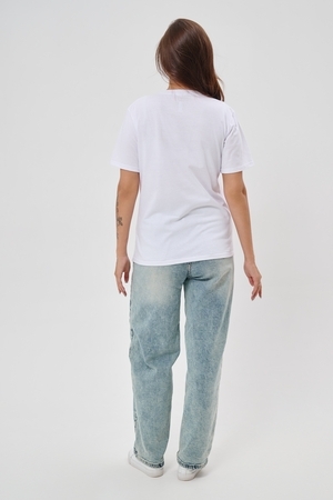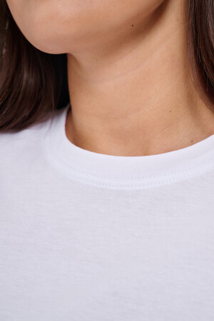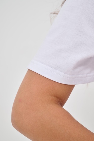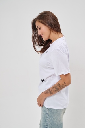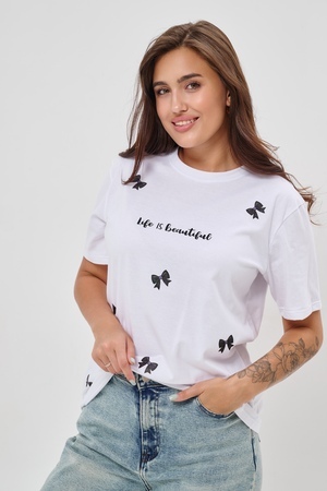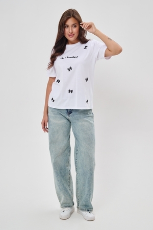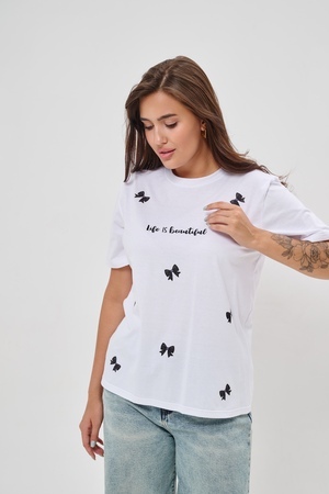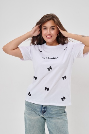 Женская футболка приталенного кроя, изготовлена из мягкого материала — кулирки. Элегантная форма с короткими рукавами и аккуратным круглым вырезом создают ощущение лёгкости и свежести образа. Особенное внимание привлекает надпись на груди, украшенная минималистичными маленькими бантиками в сдержанном чёрном цвете. Такая деталь добавляет образу шарма и игривости, оставаясь одновременно простой и изысканной. Футболка легко впишется в гардероб современной девушки, добавив нотку кокетства любому образу.