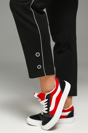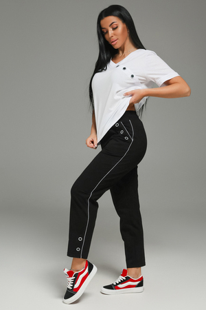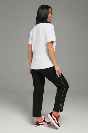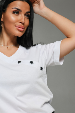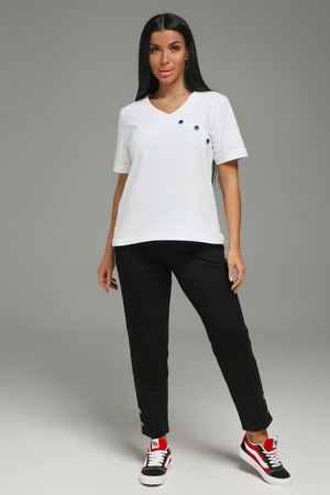 Брючный трикотажный костюм - это стильный и элегантный предмет гардероба, идеально подходит для дома и отдыха на любой период: весенний, осенний, летний и зимний. Костюм состоит из брюк и футболки, выполненный из высококачественного трикотажного материала. На карманах и по низу брюк декор дополнен декоративными пуговицами, как и на обтачке по фигурной планке. Изысканный комплект является идеальным выбором для всех, кто ценит качество и элегантность.