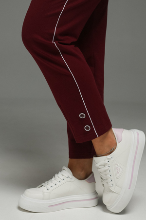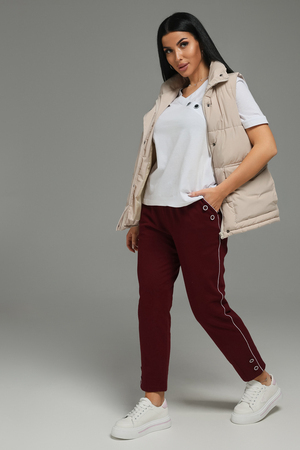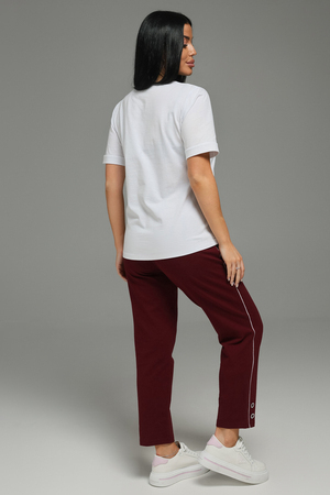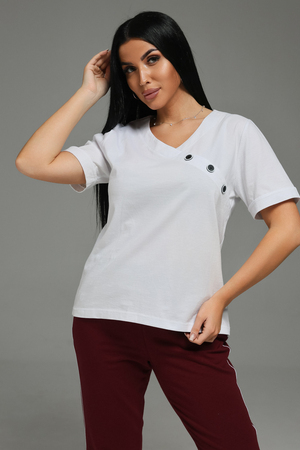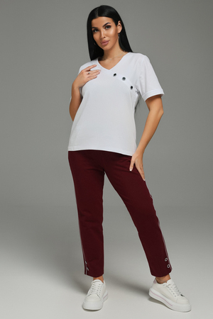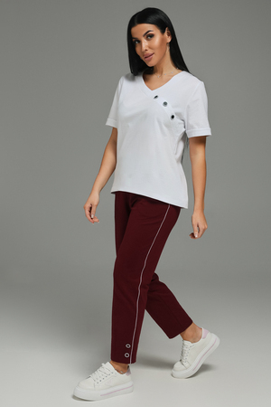 Брючный трикотажный костюм - это стильный и элегантный предмет гардероба, идеально подходит для дома и отдыха на любой период: весенний, осенний, летний и зимний. Костюм состоит из брюк и футболки, выполненный из высококачественного трикотажного материала. На карманах и по низу брюк декор дополнен декоративными пуговицами, как и на обтачке по фигурной планке. Изысканный комплект является идеальным выбором для всех, кто ценит качество и элегантность.