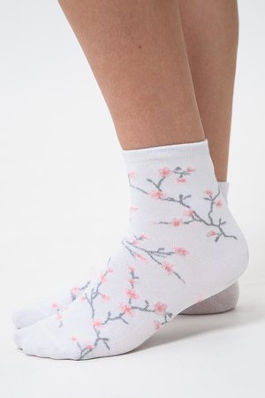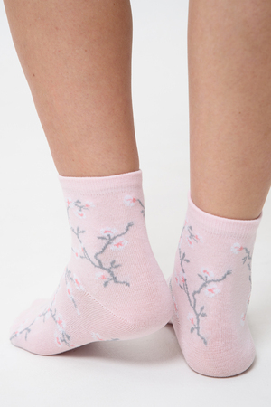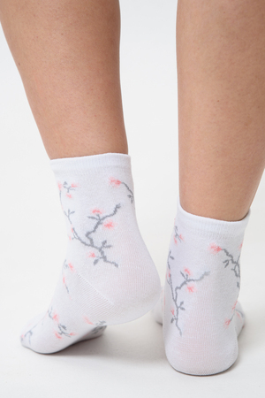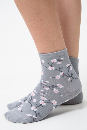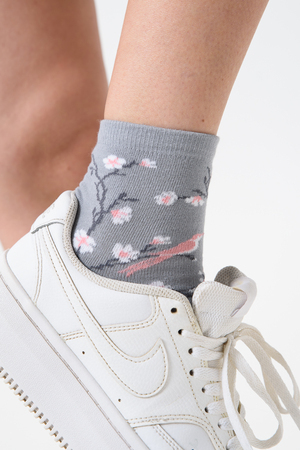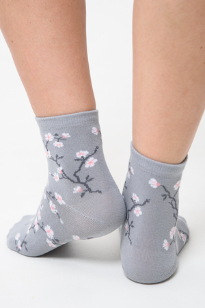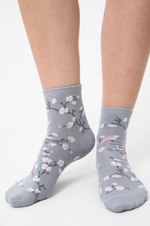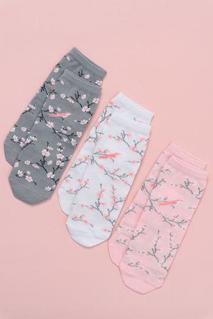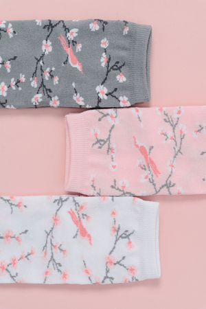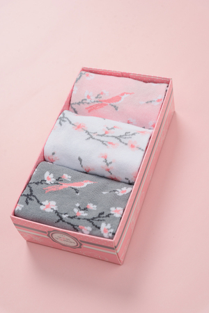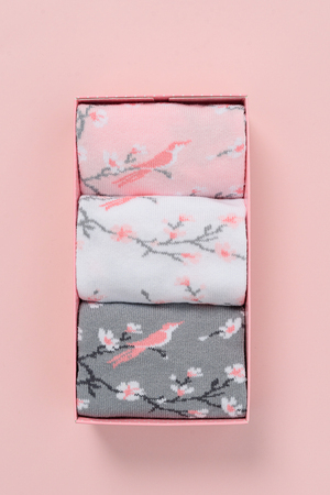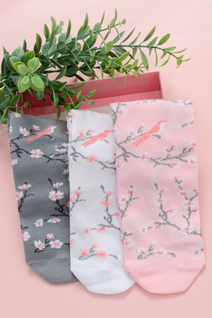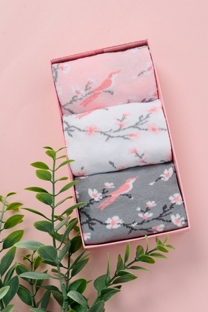 Подарочный комплект женских носочков. Очень нежные и приятные расцветки с изображением цветов и птиц. В комплекте три пары носков разных расцветок.