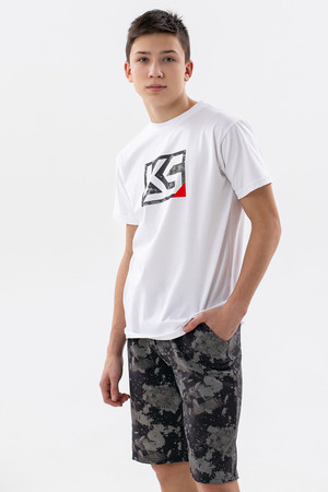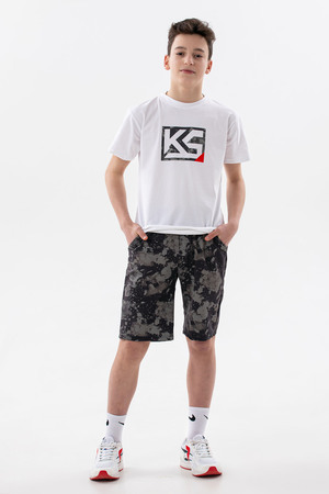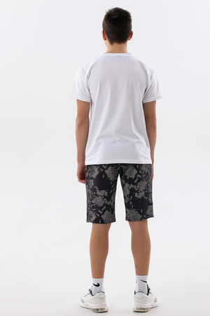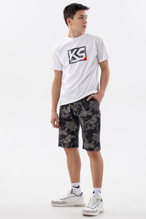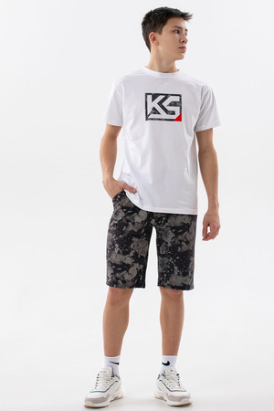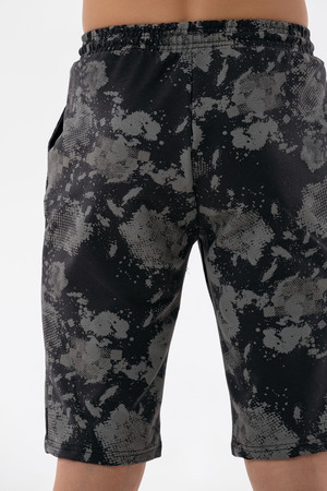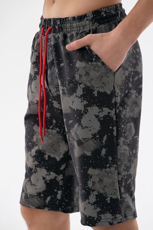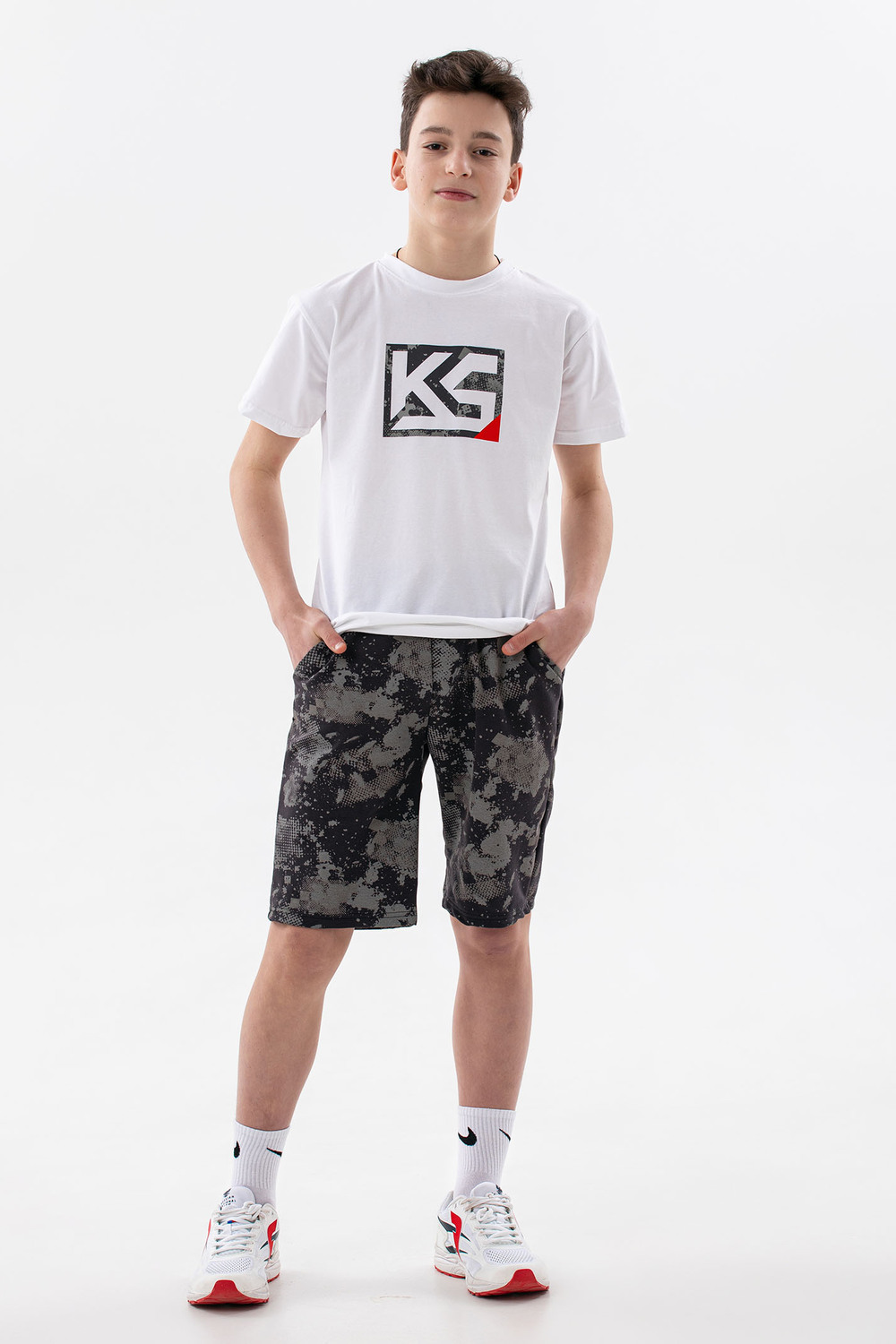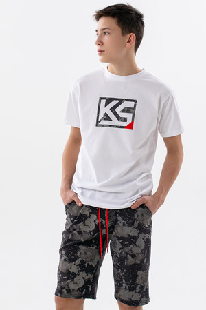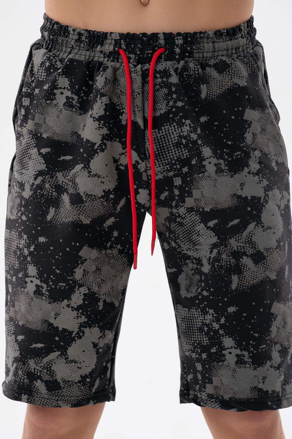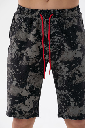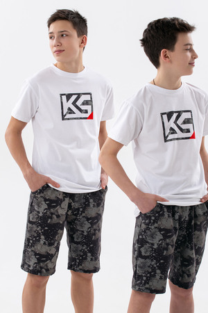 Костюм для подростков состоит из двух изделий - футболки и шорт. Футболка выполнена из ткани с абстрактным принтом. Футболка прямого свободного кроя, круглый вырез горловины, втачной рукав. Шорты выполнены из футера 2-х нитки, прямого кроя, с удобной посадкой. С боковыми карманами и красным шнурком.