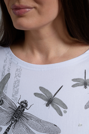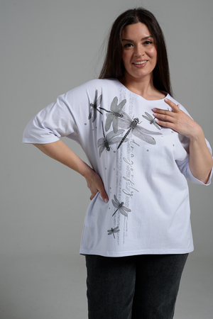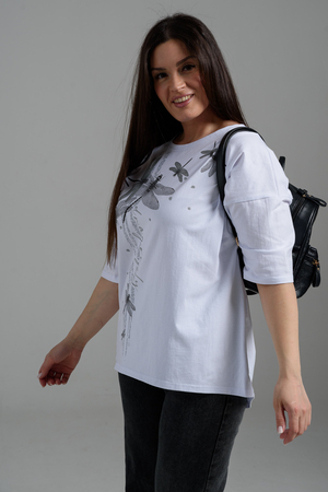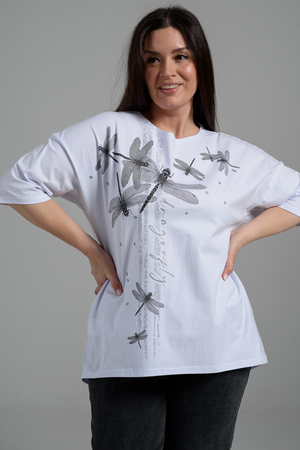 Туника женская прямого силуэта. Горловина округлая. Низ фигурный. На полочке модный принт.