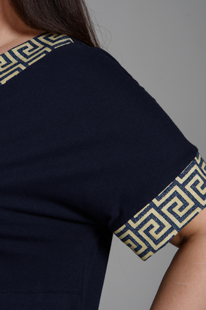 Платье прямого силуэта, с V-образной фигурной горловиной, с боковыми карманами, с разрезами в нижней части боковых швов. Рукав цельнокроеный, короткий, с манжетом из отделочного полотна. Горловина обработана обтачкой из отделочного полотна.