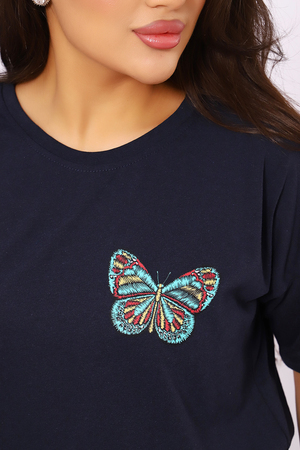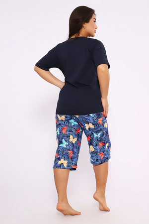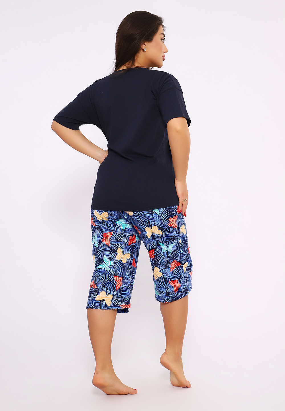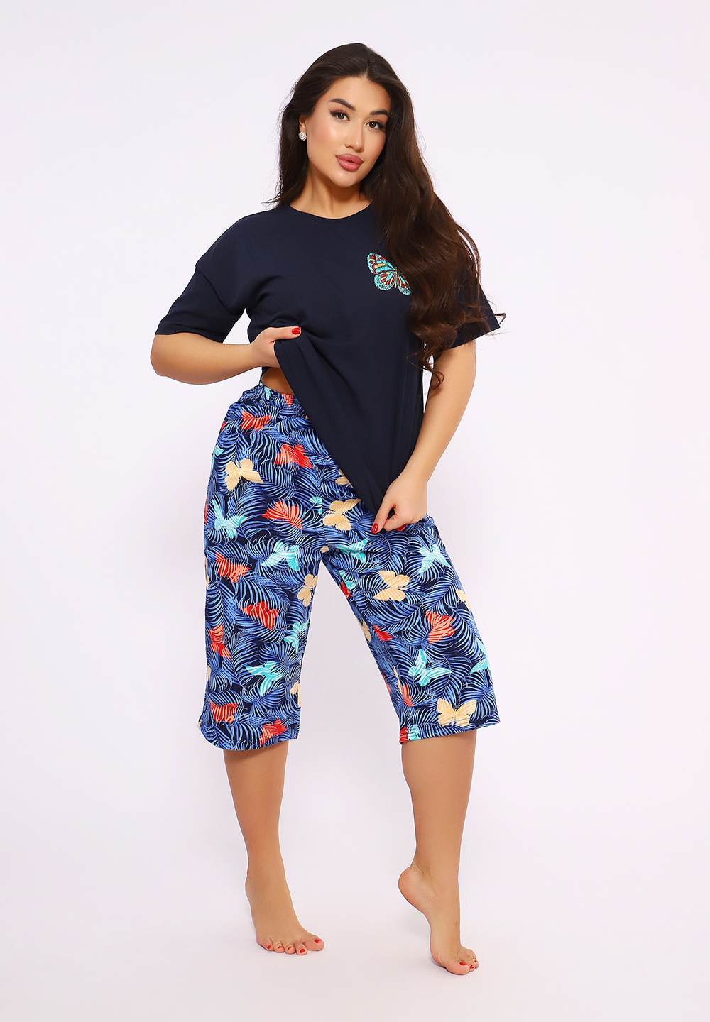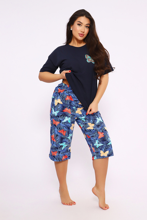 Дизайн: Футболка однотонная с декорацией.  Бриджи свободного фасона из хлопка - с набивным рисунком.