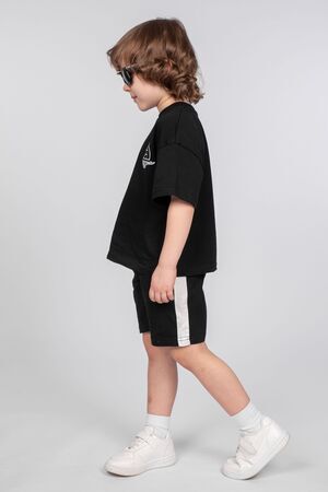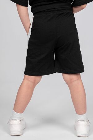 Шорты для мальчика прямого силуэта. Пояс отрезной в цвет изделия, выполнен из кашкорсе, с эластичной тесьмой внутри. По поясу шорт вставлен плоский утягивающий шнурок, в цвет изделия. По боковому шву втачаны лампасы. Низ изделия обработан швом в подгибку. В боковом шве карман с отрезным бочком.