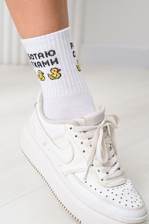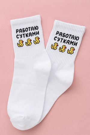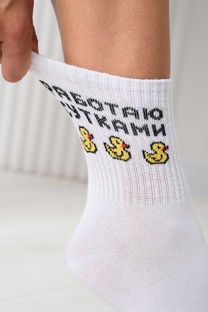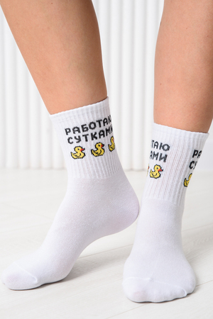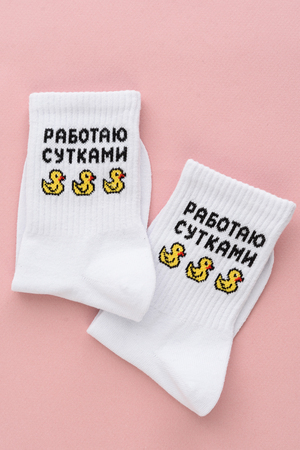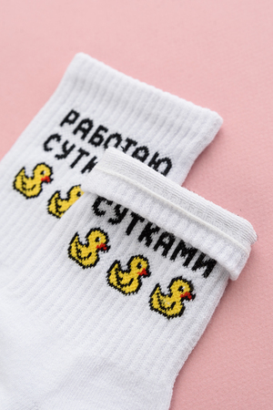 Милые женские носочки с изображением утят и надписью "Работаю сутками."