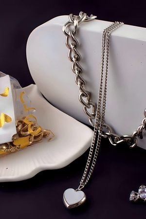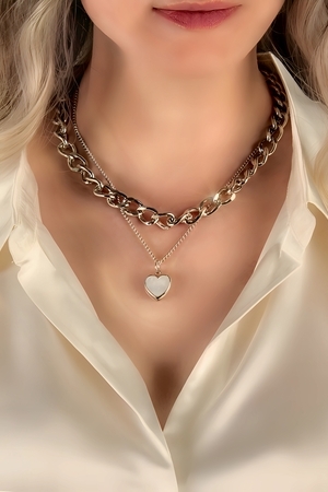 Колье на шею Сердце двустороннее Перламутр/Золото, + Подарок, в подарочном мешочке: двойная массивная цепочка на шею с подвеской Сердце двустороннее Перламутр/Золото создана из экологичного сплава отличается полновесной конструкцией и изысканной премиальной обработкой глянцевых звеньев, напоминающей роскошь драгоценных металлов. Сочетание массивной цепочки на шею и более тонкой длинной, украшенной двусторонней подвеской в форме сердца, создаёт эффектный и запоминающийся акцент и станет символом гармонии и вдохновения. Носите колье в соответствии с вашим настроением - она имеет две стороны: одна сторона сердца– нежный перламутр, дарящий образу романтичность, а другая – глянцевое золото, добавляющее элегантности и шика. Регулируемая длина колье составляет 36 см, а благодаря удлинительной цепочке (6 см), вы сможете подобрать оптимальную посадку, добавив длины по своему желанию и идеально подстраивать его под любой вырез или стиль одежды. Колье легко впишется в разный гардероб — от легких летних образов до уютных осенне-зимних нарядов. Оно также идеально подходит для повседневной носки, добавляя изысканности даже самому простому образу. Сегодня крупные геометрические аксессуары под винтаж на пике популярности, и мы предлагает вам коллекцию, которая соответствует самым актуальным трендам в мире бижутерии. Каждое наше изделие – это изящное сочетание стиля и комфорта. Мы тщательно отбираем лучшие модели, чтобы каждая наша вещь была необычным и модным украшением, которое приятно получить. Современный дизайн и универсальный размер ожерелья подходит и для молодых девушек, и для женщин, которые ценят изысканность. А утончённый стиль станет дополнением вечернего образа, праздничного наряда, строгого офисного имиджа или просто внесёт яркую деталь в повседневное время. Оно поможет вам создать неповторимый образ, который запомнится окружающим.