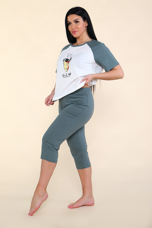 Представляем вашему вниманию наш комфортный домашний костюм, который включает в себя футболку с округлым вырезом и бриджи средней посадки. Эти трикотажные бриджи прекрасно пропускают воздух, что делает их идеальными для выполнения домашних дел или отдыха на даче. Вы также сможете насладиться сладким сном в этой уютной пижаме.