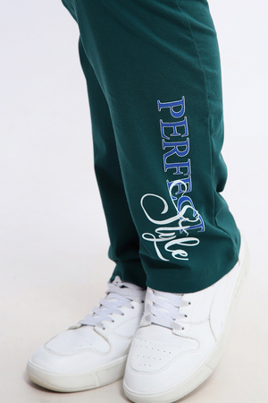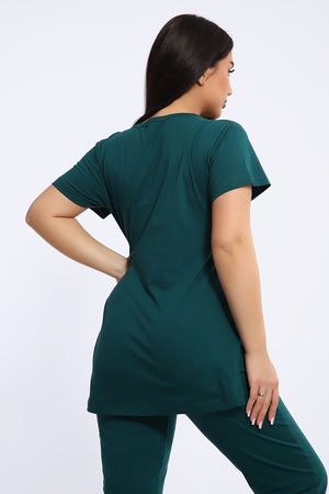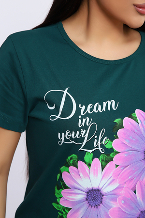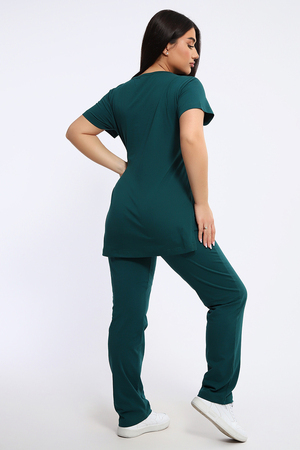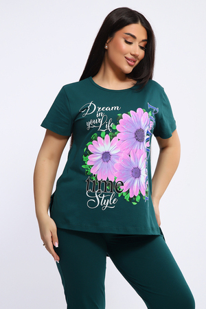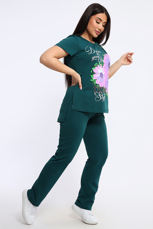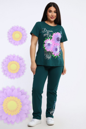 Посмотрите какая нежность. Женский костюм с брюками включает в себя стильный верх - футболку с удлиненной спинкой и двумя боковыми разрезами, украшенную красивым цветочным принтом. Брюки в комплекте длинные и свободные, также имеют оригинальный принт с надписями в нижней части.