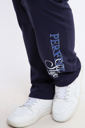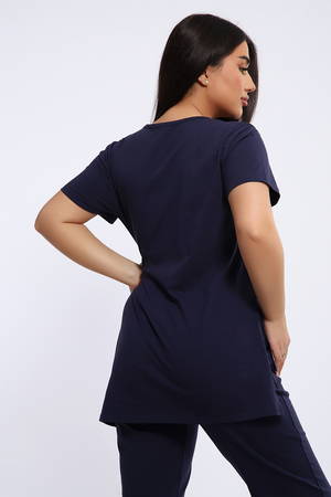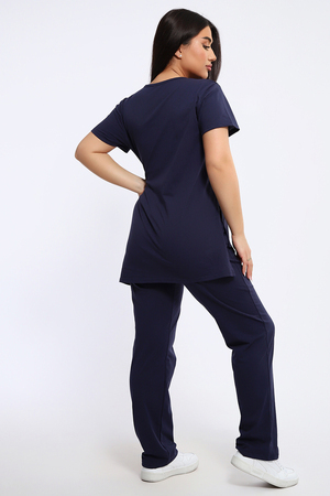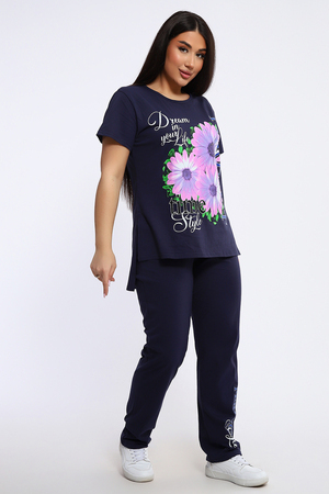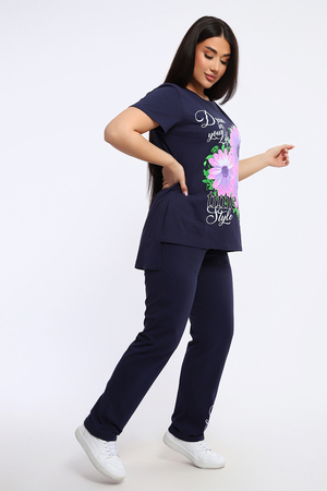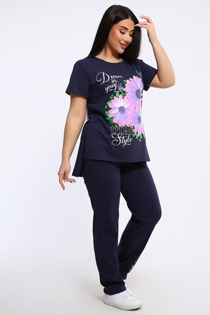 Посмотрите какая нежность. Женский костюм с брюками включает в себя стильный верх - футболку с удлиненной спинкой и двумя боковыми разрезами, украшенную красивым цветочным принтом. Брюки в комплекте длинные и свободные, также имеют оригинальный принт с надписями в нижней части.