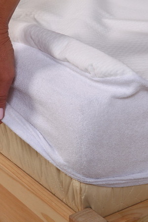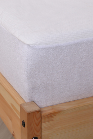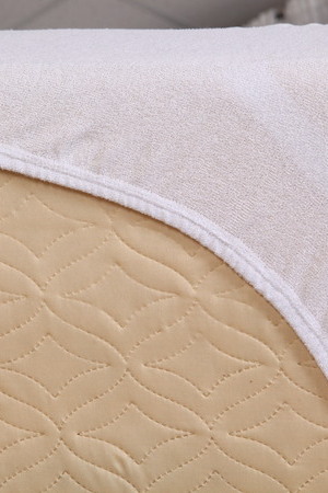 · Изделие производится из материала "Double Jersey" - термостеганное полотно плотностью 250 г/м2, скрепляемого полиэфирным волокном и имеющий непромокаемую мембрану с обратной/нижней стороны, борт наматрасника выполнен из махровой ткани.