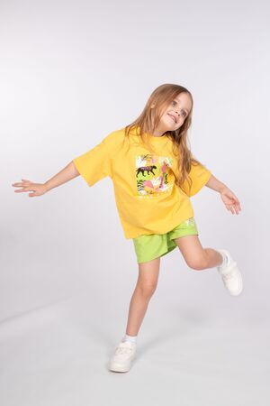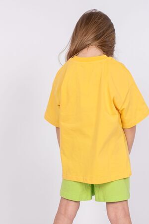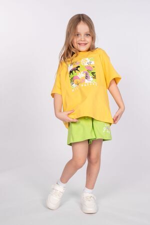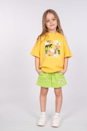 Футболка для девочки свободного силуэта (оверсайз) с коротким рукавом. Горловина круглая, обработана обтачкой из рибаны. Низ изделия и рукава обработаны швом вподгибку. На полочке принт Шелкография. Надпись переводится как "Дикая природа".