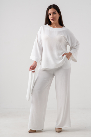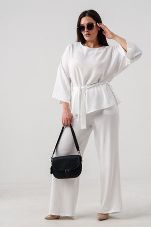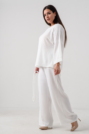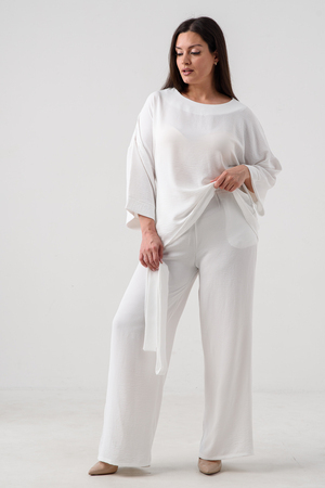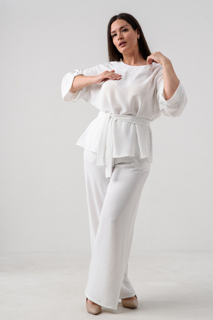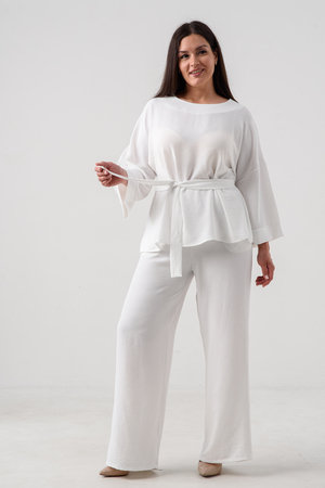 Женский брючный костюм из сингапура-это элегантное и удобное решение для тех, кто ценит стиль и комфорт. Он состоит из блузки и брюк свободного кроя на резинке с карманами.