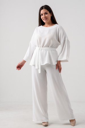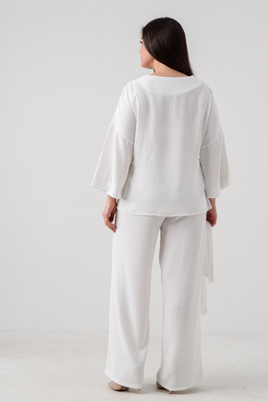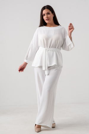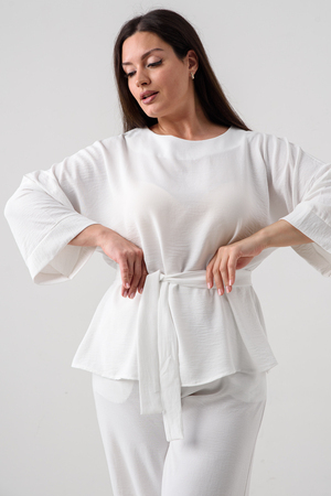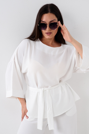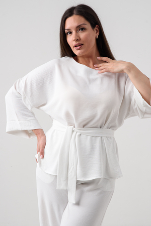 Блузка привлекает внимание длинным расклёшенным рукавом на манжете, что придаёт наряду изысканность и утончённость. Наличие пояса подчёркивает талию и добавляет изящества образу.