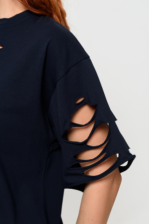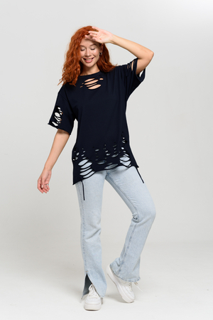 Эта женская футболка оверсайз прекрасно подойдет как для повседневной носки, так и для создания стильного образа. Модель выполнена из мягкого хлопка, обеспечивая комфорт в носке. Оригинальный дизайн с рваными элементами добавит вашему образу дерзости и индивидуальности. Стильная модель нирвана подойдёт для высоких и невысоких, для полных и худых, и даже plus size.