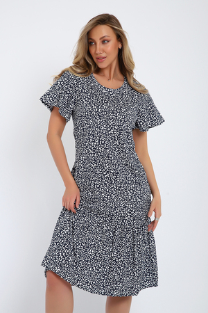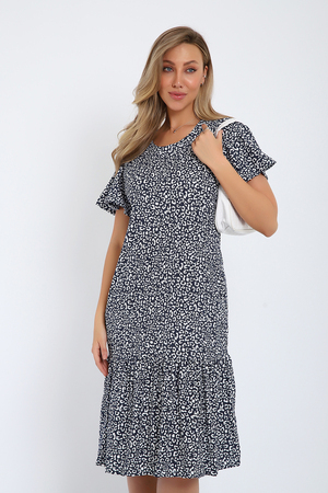 Платье свободного кроя с короткими рукавами - крылышками. По низу изделия широкий волан на сборке. Карманы в боковых швах.
