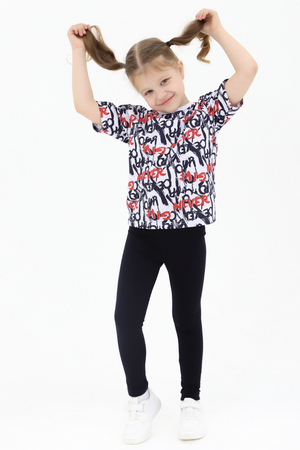 Костюм состоит из легинс с эластичным поясом и футболки. Футболка выполнена из высококачественного хлопка, что гарантирует комфорт и удобство в носке. Лосины выполнены из кулирки с лайкрой — эластичного трикотажного полотна, которое не стесняет движения.