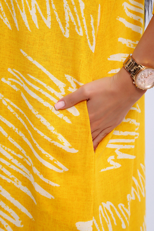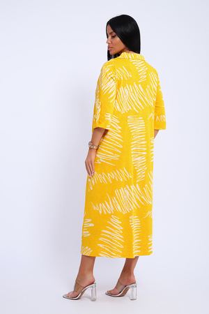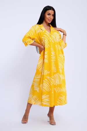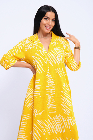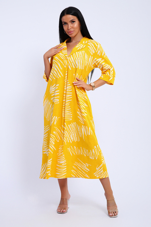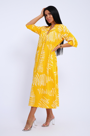 Платье женское свободного покроя. Воротник отложной рубашечного типа, образует V-образный вырез. Платье с карманами в боковых швах. Длина платья чуть выше щиколотки. Рукав 3/4 с манжетой, поднят патой.