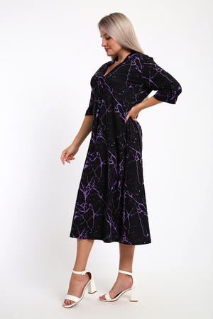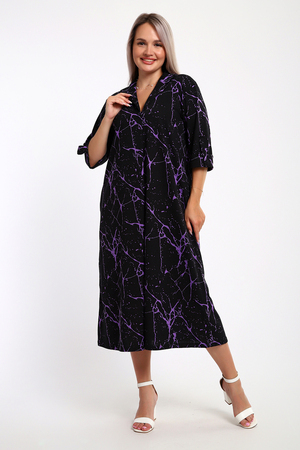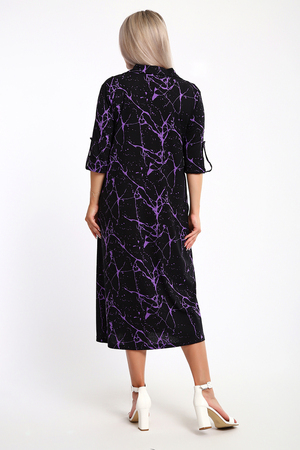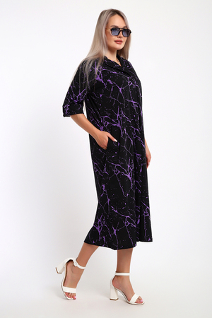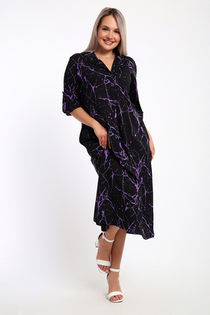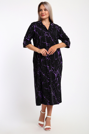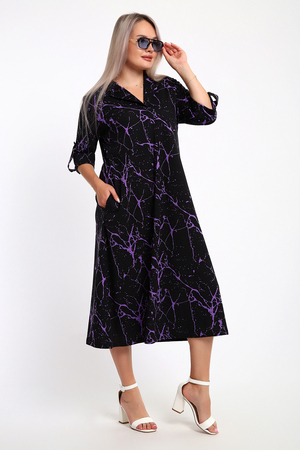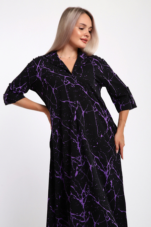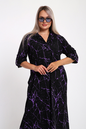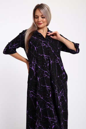 Платье женское свободного покроя. Воротник отложной рубашечного типа, образует V-образный вырез. Платье с карманами в боковых швах. Длина платья чуть выше щиколотки. Рукав 3/4 с манжетой, поднят патой.