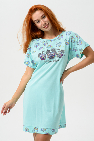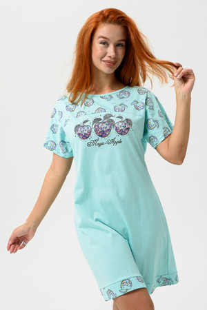 Сорочка с цельнокроеным рукавом, с кокеткой и двойной манжетой по линии низа из ткани-компаньона. Печать - три яблочка с глитером