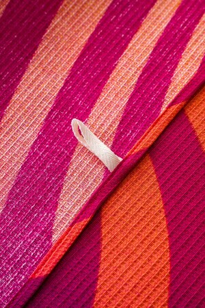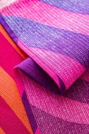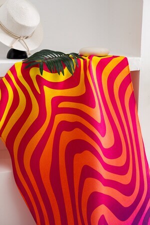 Вафельное полотно обеспечивает отличную впитываемость и быстрое высыхание, что делает его компактным и удобным для путешествий. Наслаждайтесь отпуском на море или на даче, обернувшись в это красно-желтое полотенце с абстрактным узором "Волна эмоций".